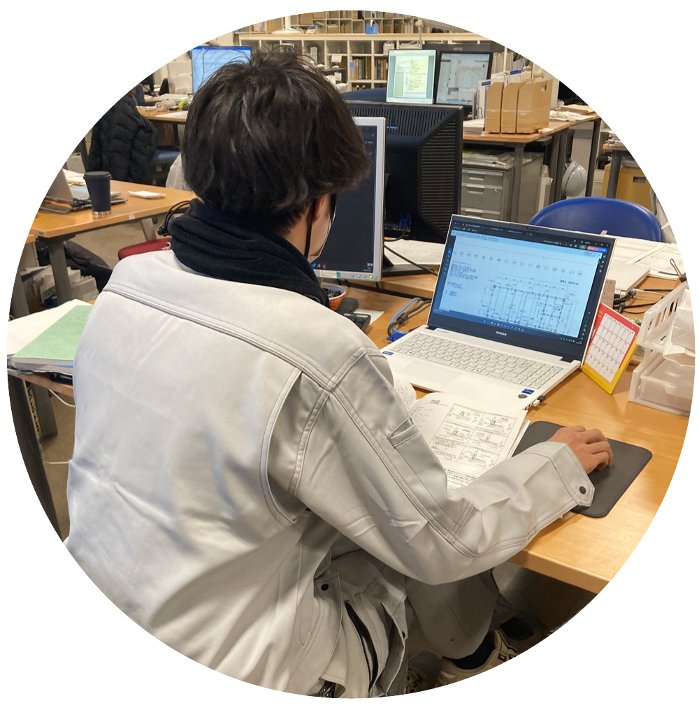 朝は、社内検査前の図面確認や書類準備、発注準備などの事務作業から始まります。