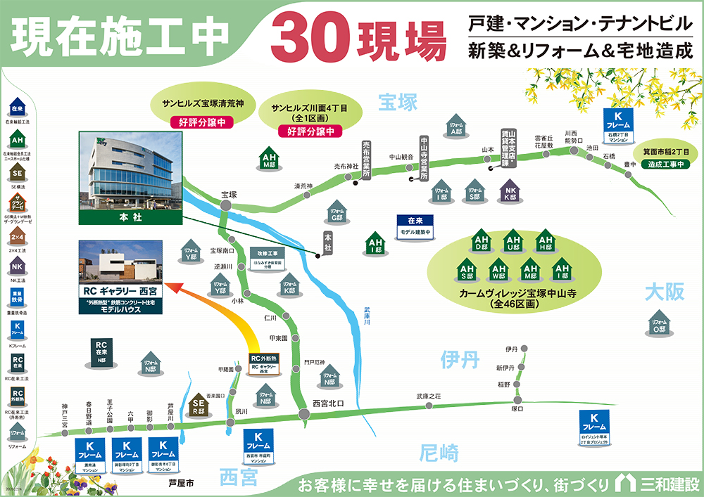2026/02/28 施工マップ 2025年3月度施工マップ 三和建設では、施工中の現場をマップにして毎月更新しています。3月は30現場が稼働中です!宝塚を中心に、尼崎、西宮方面も施工させていただいております。気になる現場など、ぜひお気軽にお問い合わせください! お問い合わせ