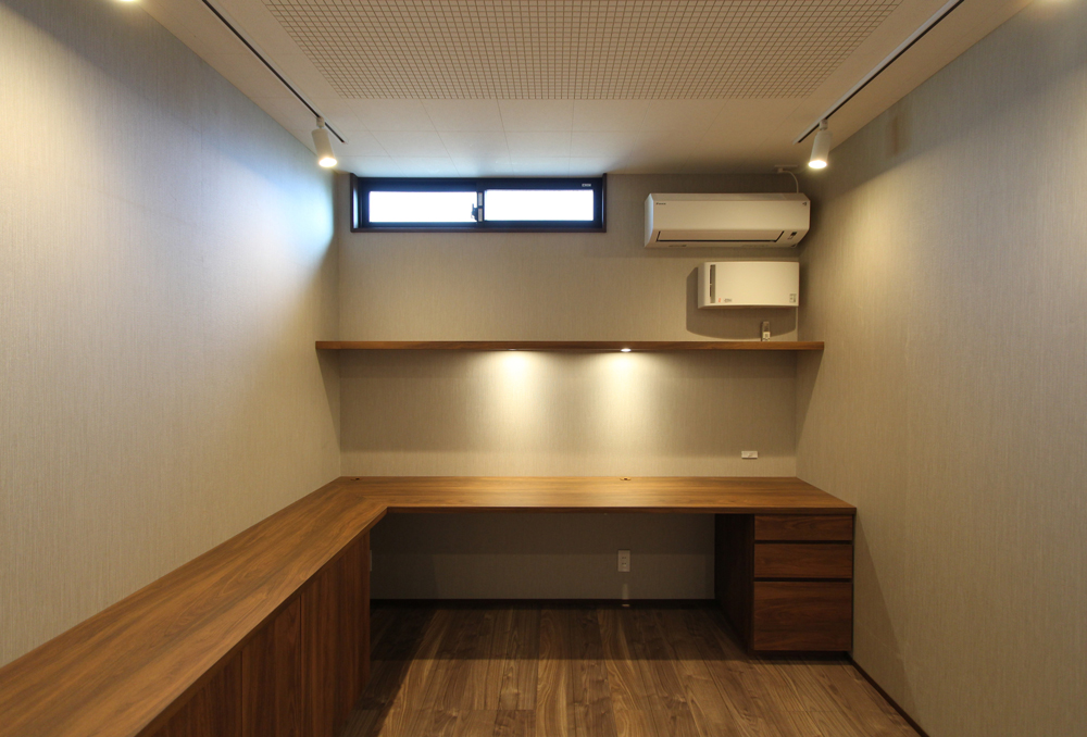 1 階はインナーガレージと行き来できる事務所(書斎)、DK には大判タイル・オーダーのア