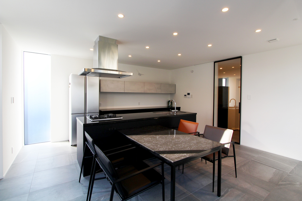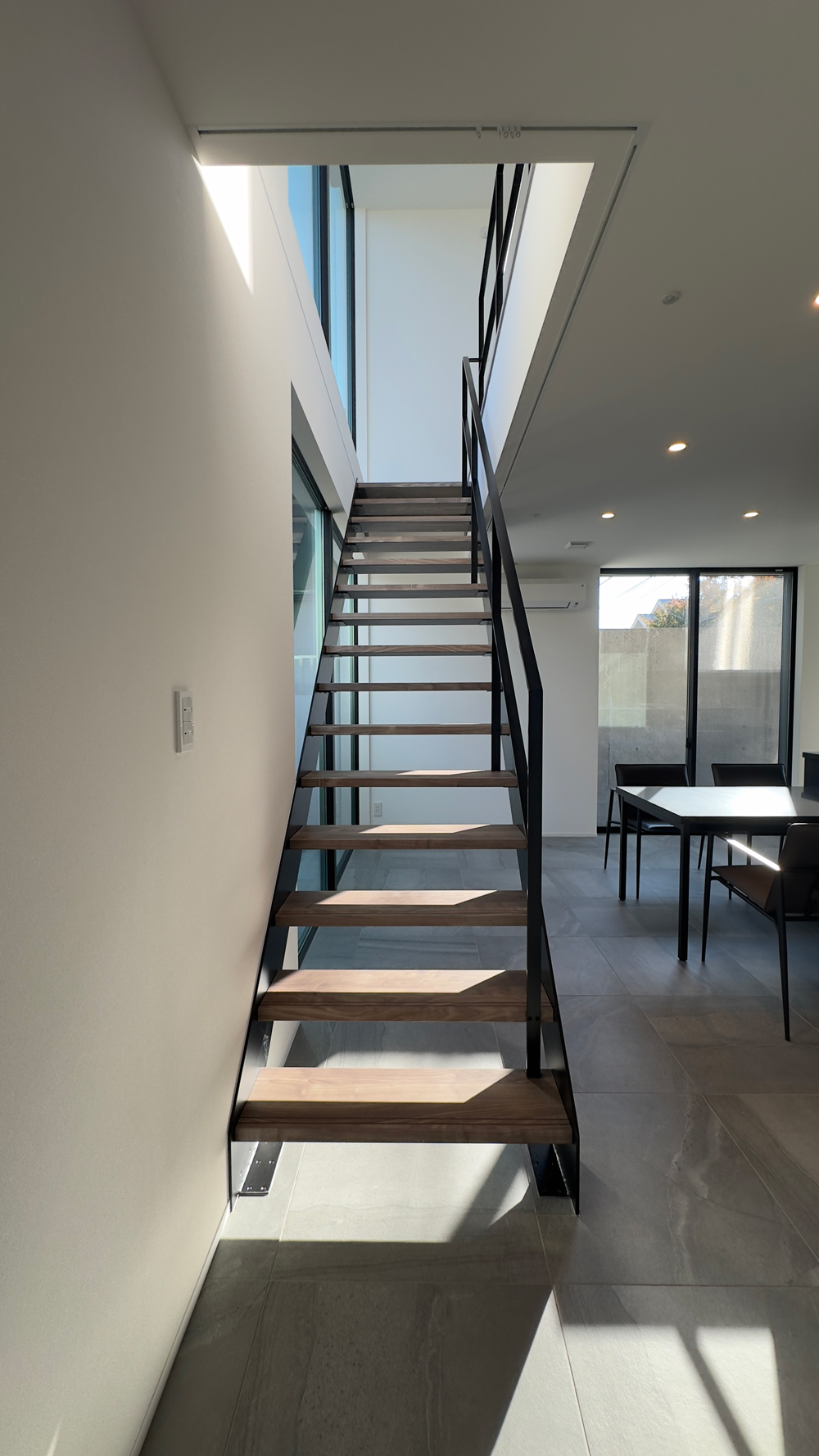 イランドキッチン・スケルトンのデザイン階段を設け、都会的で洗練されたアーバンシック