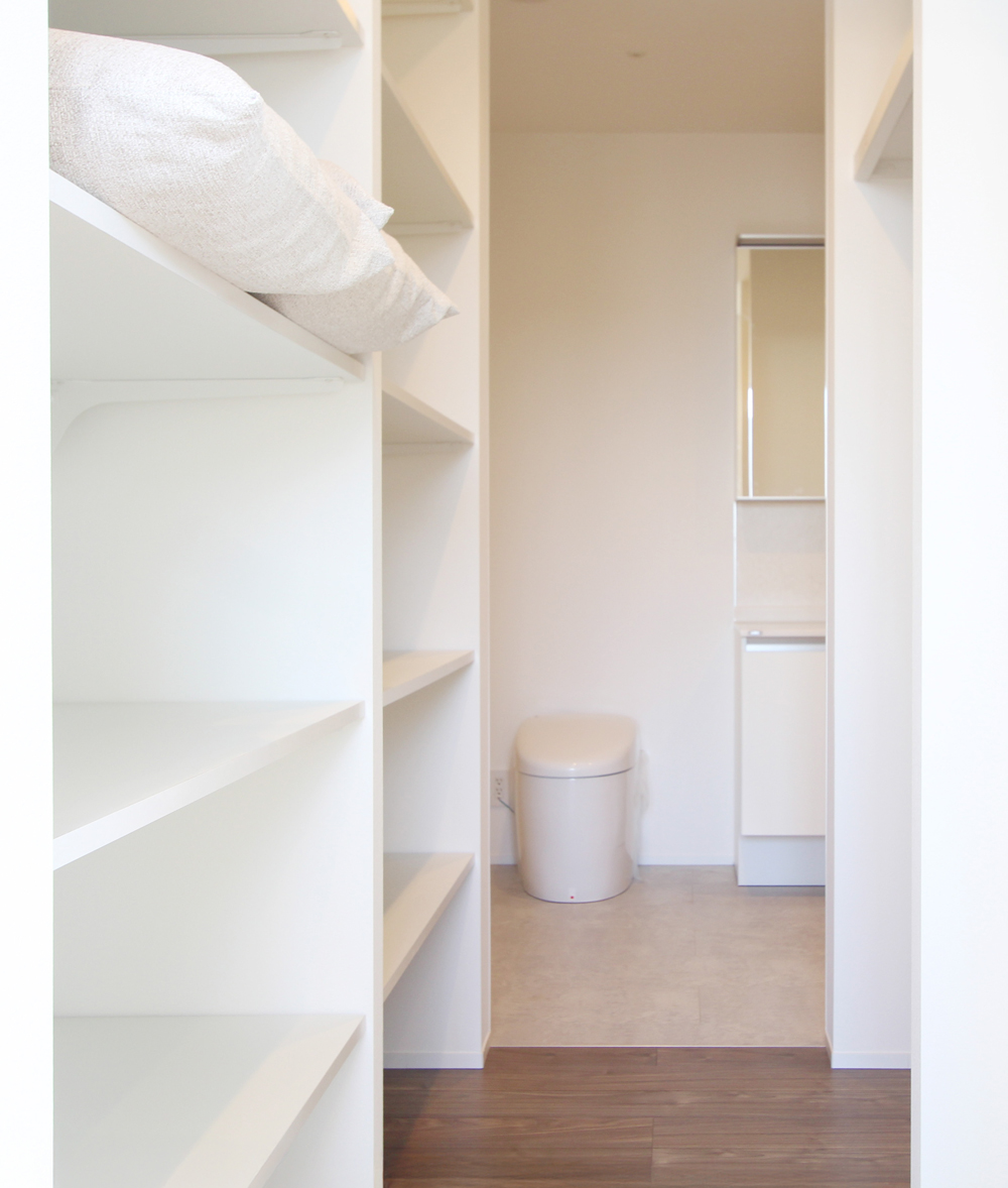 2 階はリビング・個室・収納・水廻りを配置し、LDK を上下階で分離した少し変わった空間構