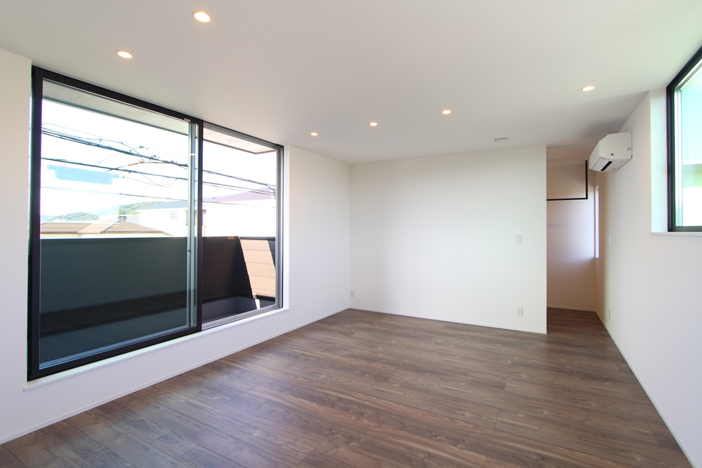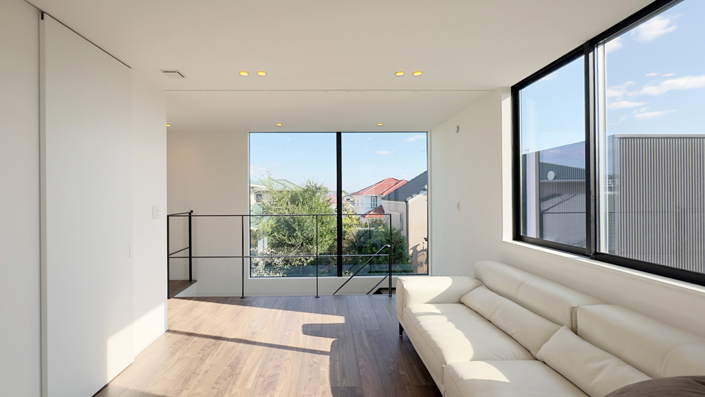 ダイニングキッチンとリビングに設けた東側の大開口は、借景を楽しむことができ、目隠し