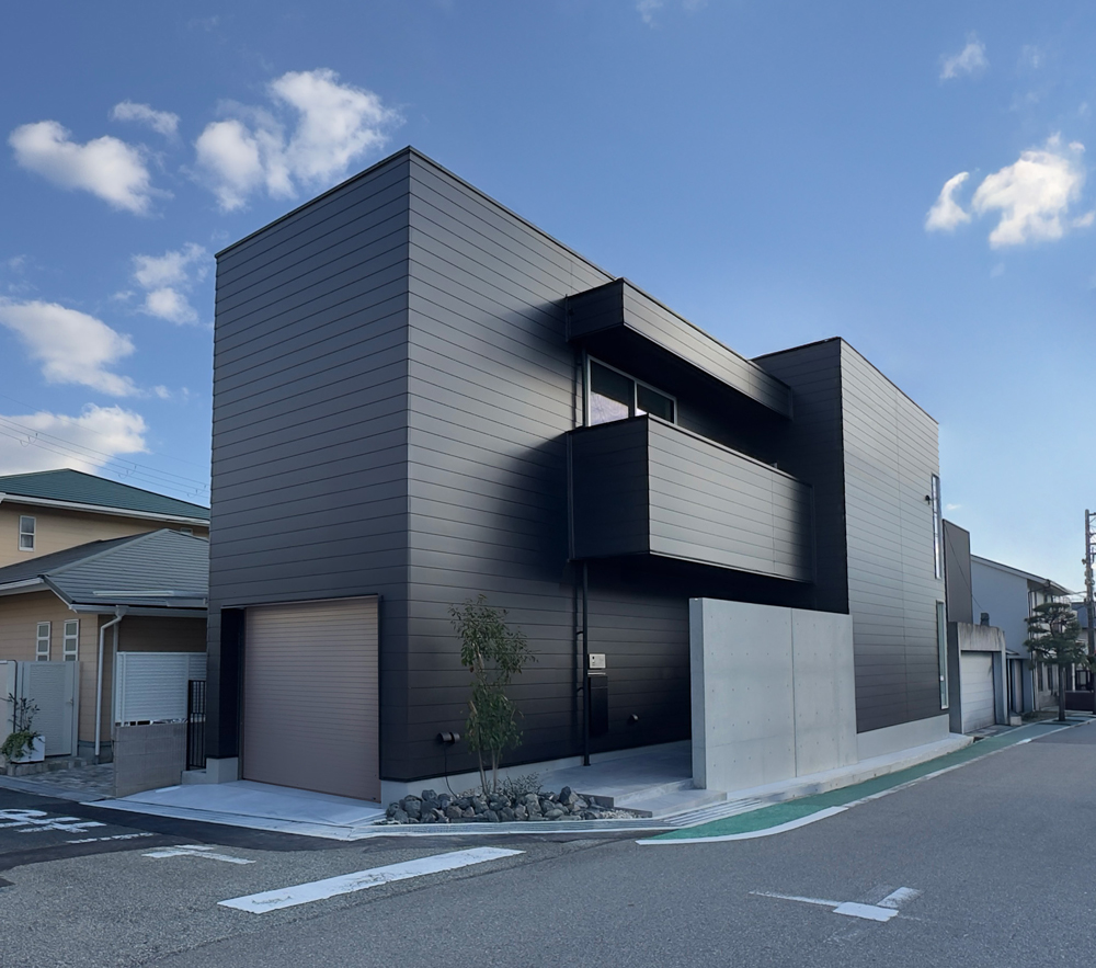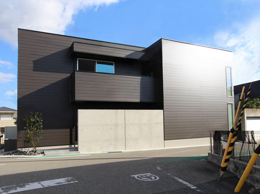 ファサードはスクエアなフォルムを意識して2 つのボックスにて構成し、屋根・外壁ともブ